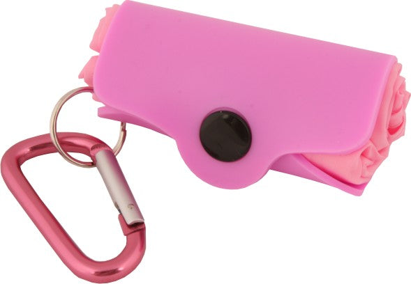 Save the environment ! This convenient re-usable shopping bag comes in a convenient holder on a carabiner so it can be hung off a handbag or belt while not in use. Pink bag and holder